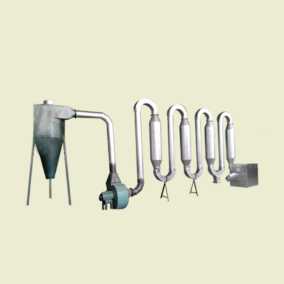 該機(jī)主要由熱風(fēng)爐、U型脈沖管、風(fēng)機(jī)、剎克隆等部分組成,在引風(fēng)機(jī)作用下熱風(fēng)和物料同時(shí)被吸入管道中。含水物料懸浮于高速熱氣流中,通過干燥管道。由于脈沖管作用,氣流發(fā)生旋轉(zhuǎn),使物料不斷翻滾,增大了與熱氣流的傳熱交換,提高了熱效率。物料在3-5秒時(shí)間內(nèi)即完成干燥,被旋風(fēng)分離器及袋式收集器收集?;厥招矢哌_(dá)98%,可連續(xù)干燥大量物料。