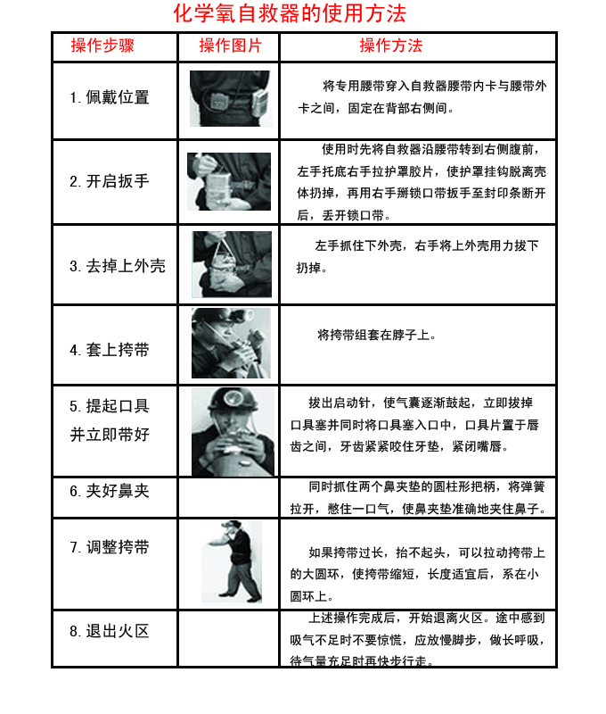 (1)使用范圍:1. 可供煤礦井下作業(yè)人員在發(fā)生瓦斯突出、火災(zāi)、爆炸等災(zāi)害性事故時(shí),以及救護(hù)人員在呼吸器發(fā)生故障時(shí)迅速撤離災(zāi)區(qū)使用。如井下人員迂到巷道大面積冒頂,被堵人員可佩帶該自救器等待營救。
